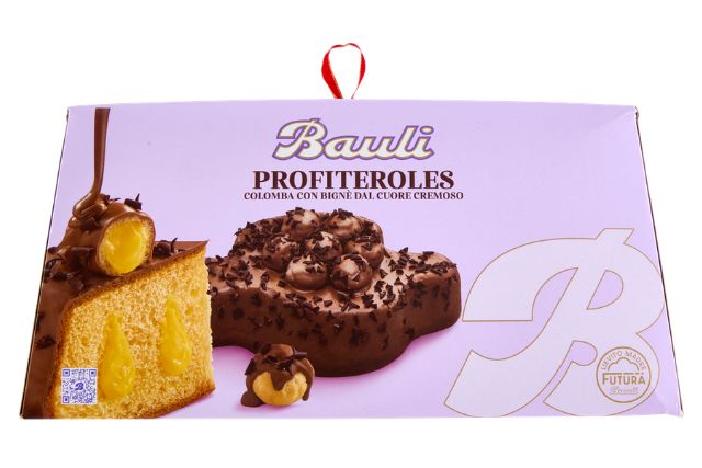 Bauli Colomba Profiteroles is an indulgent Italian Easter cake made with naturally leavened dough, inspired by the classic profiteroles dessert. Soft and fluffy, it is enriched with chocolate cream and delicious chocolate notes that create a rich and satisfying flavor.