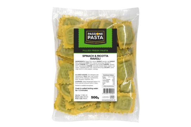 Spinach & Ricotta Ravioli (500g) are fresh Italian filled pasta made with 22% egg. Each 15g portion contains a generous 67% filling of creamy ricotta and tender spinach, creating a classic, delicious combination loved in traditional Italian cuisine.